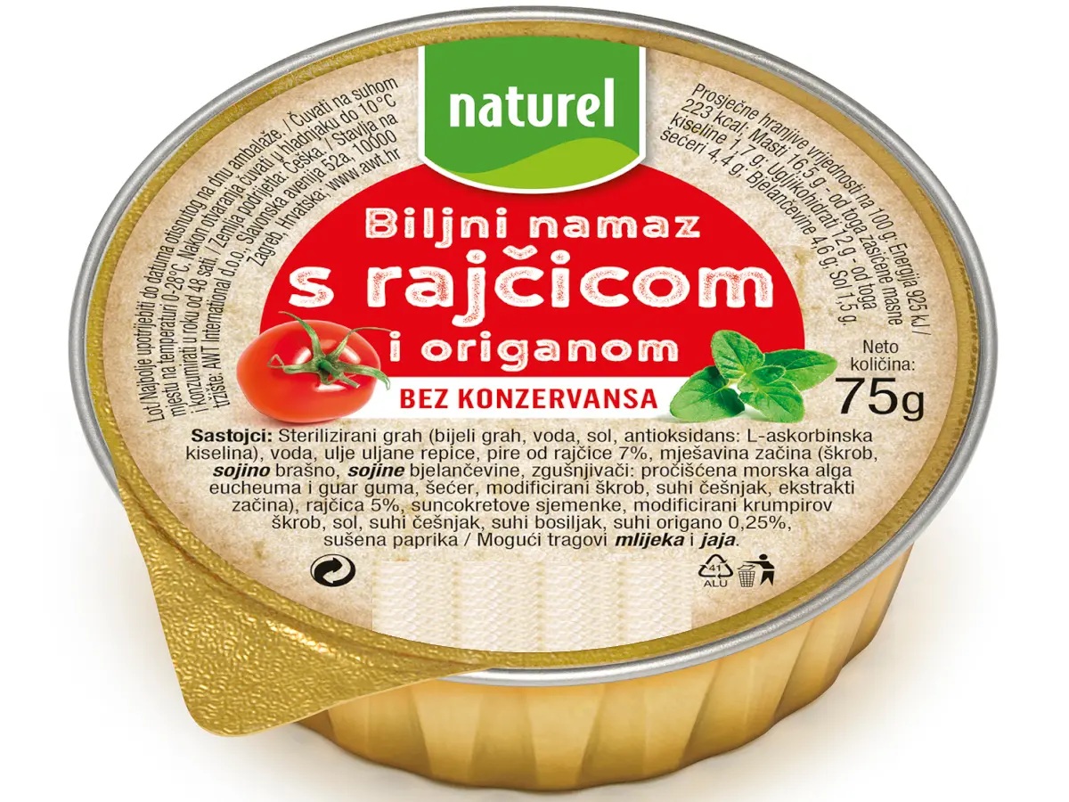 Sterilizirani grah (bijeli grah, voda, sol, antioksidans: L-askorbinska kiselina), voda, ulje uljane repice, pire od rajčice 7 %, mješavina začina (škrob, sojino brašno, sojine bjelančevine, zgušnjivači: pročišćena morska alga eucheuma i guar guma, šećer, modificirani škrob, suhi češnjak, ekstrakti začina), rajčica 5 %, suncokretove sjemenke, modificirani krumpirov škrob, sol, suhi češnjak, suhi bosiljak, suhi origano 0,25 %, sušena paprika.